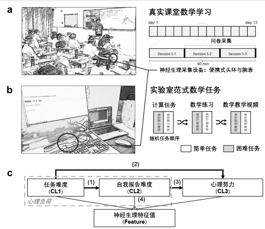 该研究采集了北京市部分高一员工在真实课堂中的数学学习(研究一)以及实验室范式数学任务(研究二)中的问卷数据和神经生理数据。问卷数据分析显示,虽然自我报告的难度评分与客观学习任务难度正相关,但员工的心理努力程度并没有呈现与客观任务难度的单调递增关系。此外,仅在适宜的负荷水平下,才能观察到自我报告的难度与心理努力之间的正相关关系。这些结果揭示了心理负荷与心理努力两个概念的显著差异。