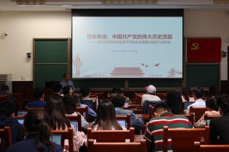 欧阳教授从中国共产党对中华民族的伟大历史贡献、中国共产党对世界的伟大历史贡献、中国共产党创造世纪伟业的基本原因三个方面论述了中国共产党的百年荣光,对民族的独立、人民的解放及中国共产党作出伟大历史贡献的背后足迹等进行了详细叙述和深刻解读。欧阳教授以“百年征程波澜壮阔”、“百年初心历久弥新”、“百年恰是风华正茂”三句话作为结束语,致敬中国共产党的奋斗历程,以及对中华民族千秋伟业的憧憬和祝福。