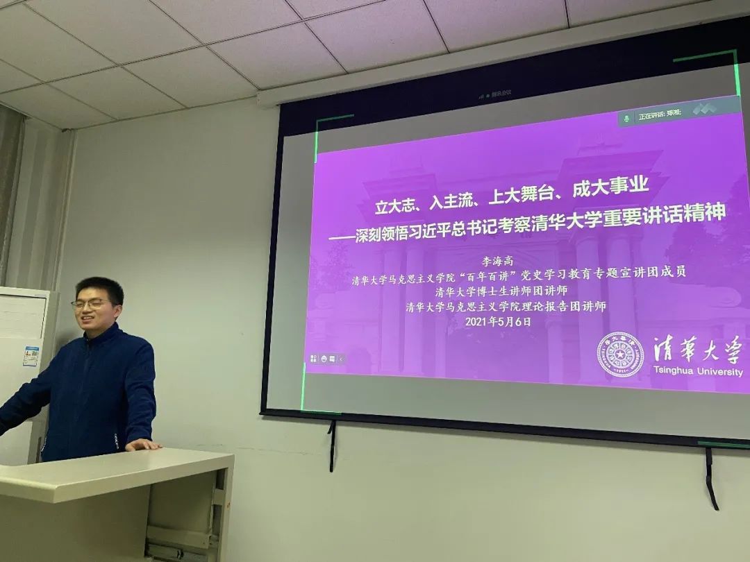 李海高从习近平总书记在师生座谈会上对青年的四方面要求出发,结合习近平总书记个人经历、在纪念五四运动100周年大会上的讲话以及其他关于青年工作的重要论述等,希望支部成员领会习近平总书记对青年的殷切期盼,在勇攀知识高峰中追求卓越,在肩负时代重任中大有作为。李海高还着重强调了“立大志、入主流、上大舞台、成大事业”是清华人所需恪守的信念,希望支部成员在做职业规划和人生道路的选择时,能到祖国和人民需要的地方建功立业。