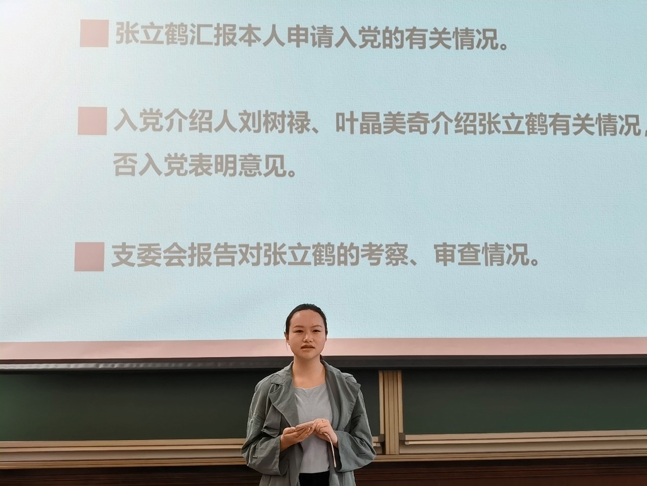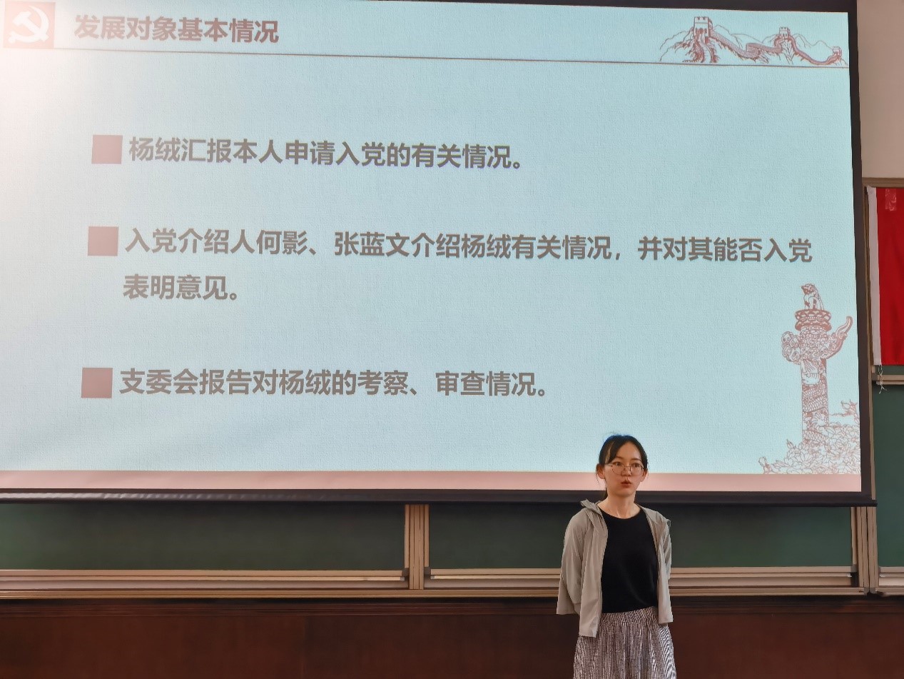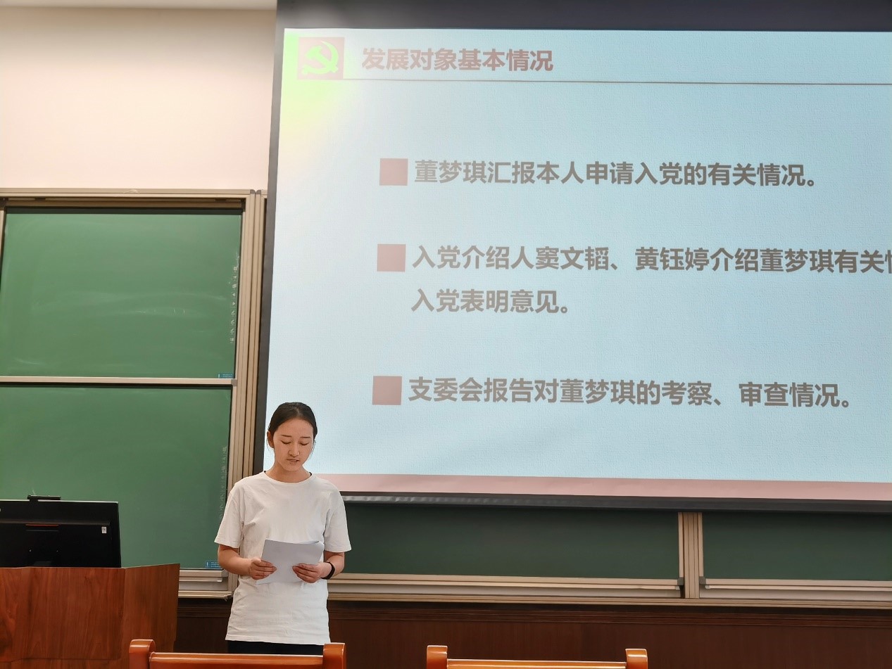 杨绒、董梦琪和张立鹤分别从入党动机、理论学习、思想认识等方面做了汇报,入党介绍人详细介绍了几位同学的政治觉悟、现实表现,党支部宣传委员宣读了政治审查情况。