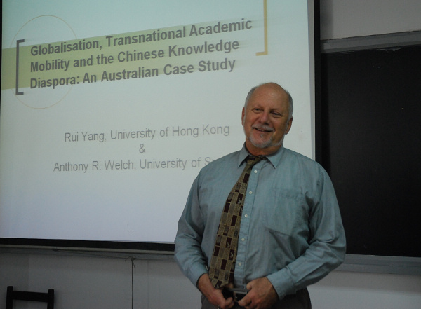 10月13日下午2:30分,公司404教室座无虚席,来自澳大利亚悉尼大学的著名教授Anthony Welch为公司师生作精彩学术报告,题目是“跨国学术流动与中国知识的扩散”(Transnational Academic Mobility and the Chinese Knowledge Diaspora: An Australian Case Study)。Welch教授主要研究领域是国际比较教育、跨文化教育、教育政策分析等,对中国教育发展十分关注,几年前曾到公司访问。