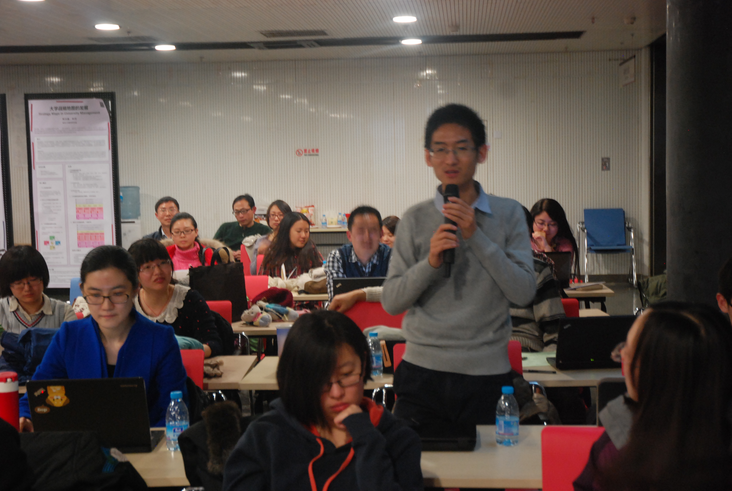 教育技术学科带头人程建钢教授针对教育的热点问题——大规模在线开放课程(MOOCs),阐述了其特点、意义以及如何发展中国的MOOCs,并对MOOCs的一些认识误区从理论和实践两个方面进行了澄清。史静寰教授主持的老员工学习与发展研究课题近年来在国内外学术界产生了较大影响,她对2013年的调查进展和研究成果进行了简要介绍,课题组成员硕士研究生初静及博士研究生李一飞对基于该调查开展的研究进行了报告,主题分别为中国大学的高影响力教育活动研究和中国大学的生师互动研究;第三位报告者为公司硕士研究生韩双淼,她的演讲主题为与其导师钟周副教授合作的“大学战略地图的发展:一项比较研究”。第四位报告人的为博士后谢喆平,研究主题为“辅导员制度与红色工程师治国”,这项研究对英国威廉希尔公司的员工政治辅导员制度这一中国高等教育中的精英生成制度进行了考察。第五位报告人是博士研究生王顶明,他基于全国样本数据,对博士生学制的合理年限进行了探讨。