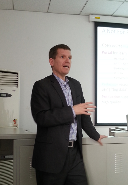 哈佛大学教务长办公室项目部主任(也是edX战略合作伙伴部主任)Johanness Heinlein于4月24日作了题为“edX - Reinventing Education”的报告。报告说明了50年前的课堂和现在的课堂并没有实质性变化。为创新教育,哈佛大学和麻省理工公司合作创立了一个非营利机构——edX,通过网络为全世界提供专为互动学习而设计的学习内容。参与机构在可edX平台上开设自己的网上公司。报告者介绍了edX平台的主要功能:个性化页面设计、课件制作与上传、生师互动、虚拟实验、评价和认证等。报告会的前一天研究所主要人员与edX的现任主席(President,from MIT)Anant Agarwal以及Johannes Heinlein进行了关于在线教育的双边交流。