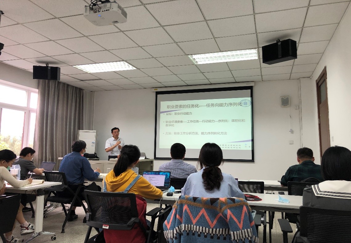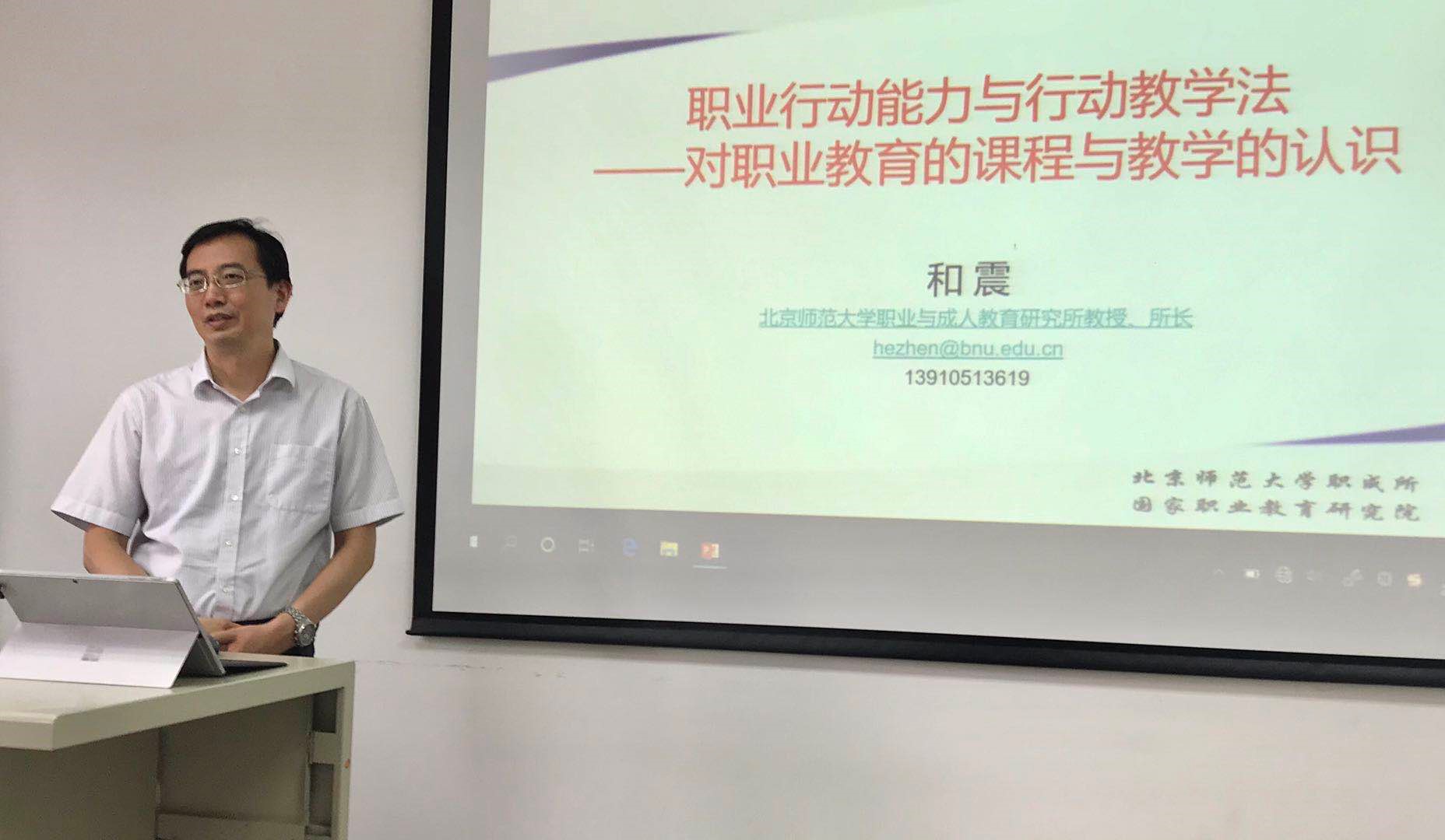 和震教授以《职业行动能力与行动教学法——对职业教育的课程与教学的认识》为题,围绕职业公司产品,从历史发展、人才分类、职业教育课程开发及其模式等多个方面,结合德国、澳大利亚、俄罗斯、美国等国家的职业教育形态,全面系统地介绍了职业教育课程形态的演进与我国职业教育课程教学的基本情况。和老师向与会师生分享了他对于职业公司产品认识的新理解,对教学关系的新导向,以及对教学职能的新解读,指出职业行动过程与职业行动学习应遵循“信息收集——计划——决策——实施——检验——评估”六个环节所组成的闭环,将专业能力、社会能力、方法能力、个性能力共同组成行动能力并嵌入具体任务中,职业公司产品要让员工在学习中做到身心合一、知行统一。与会师生针对和老师的讲座进行了积极讨论。